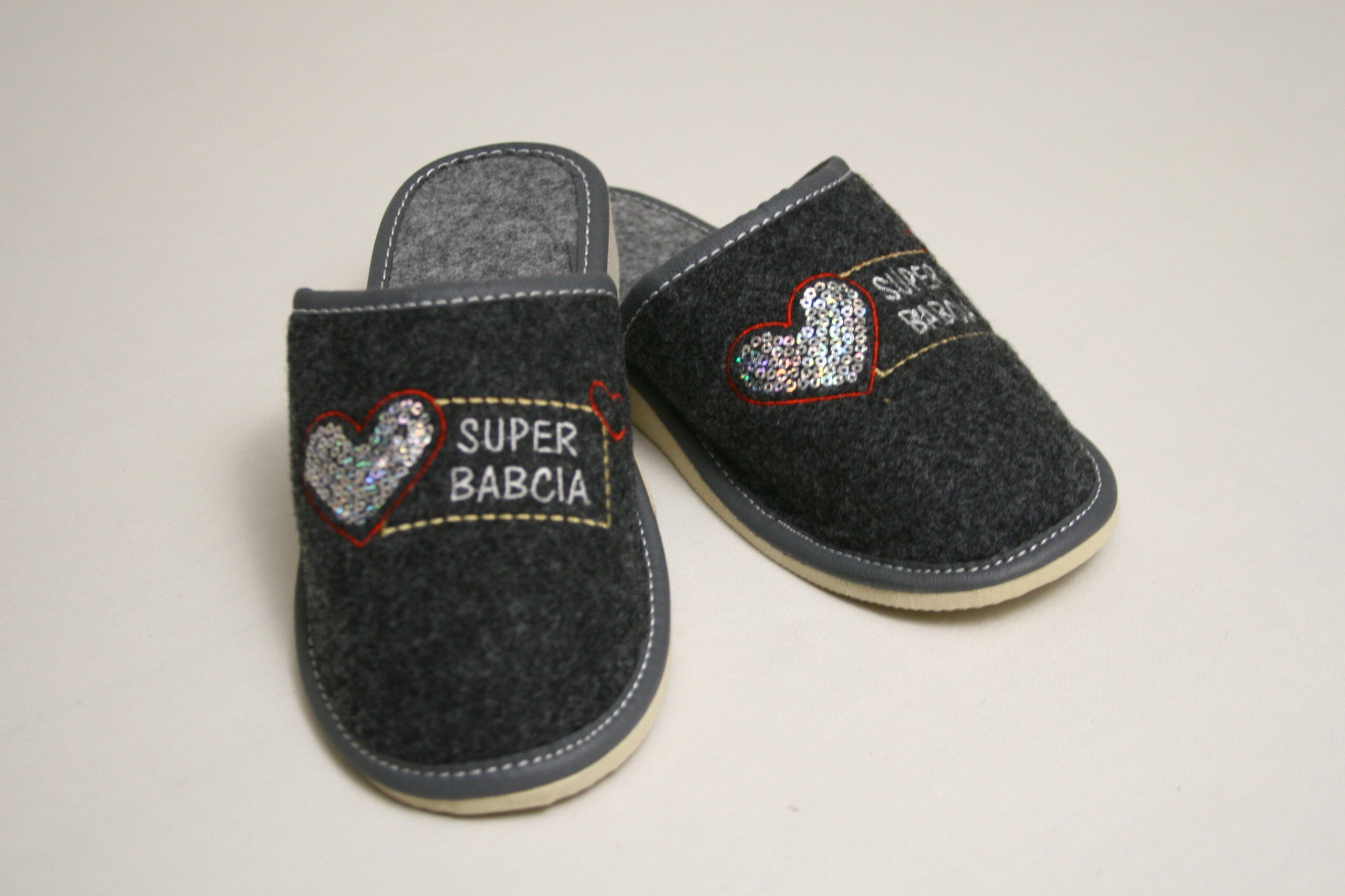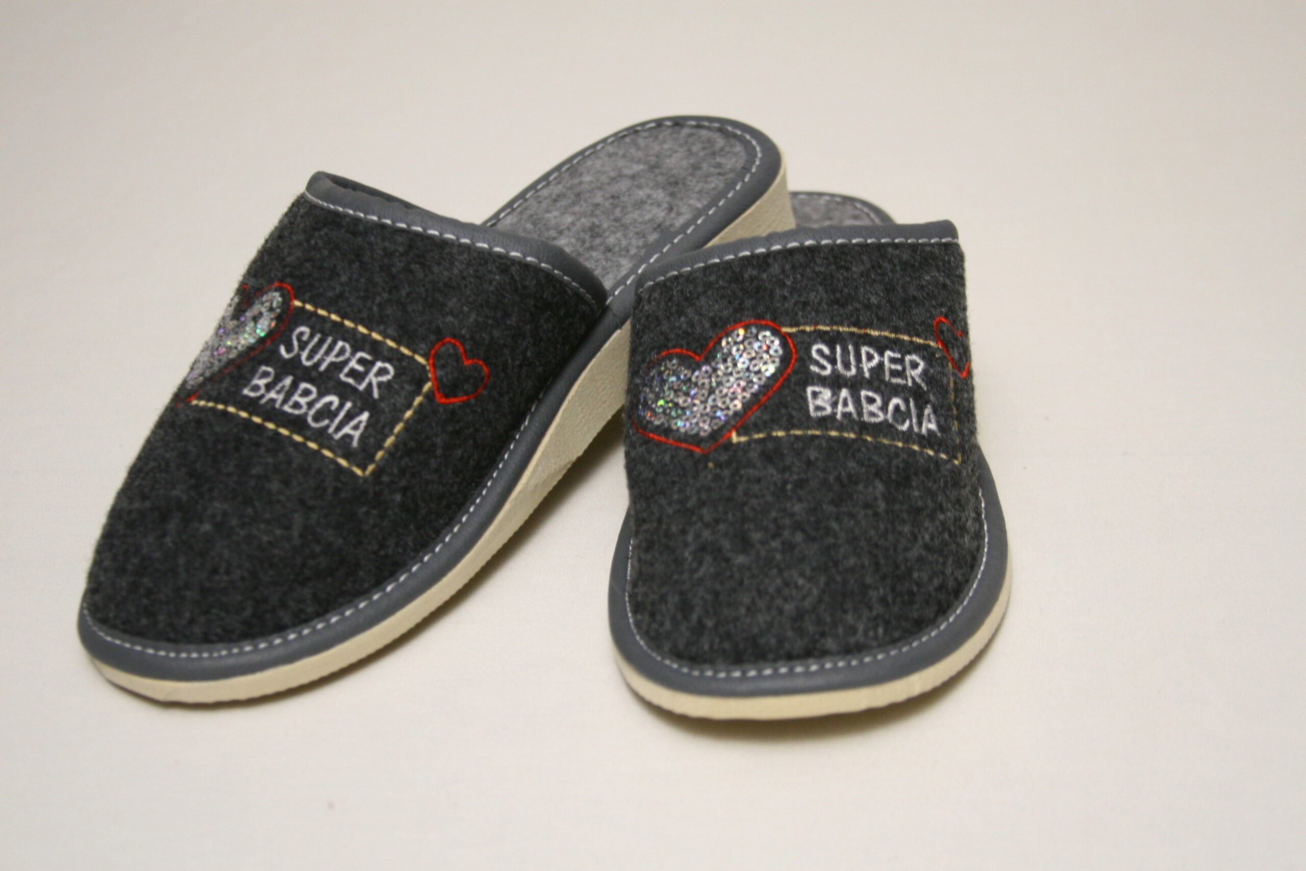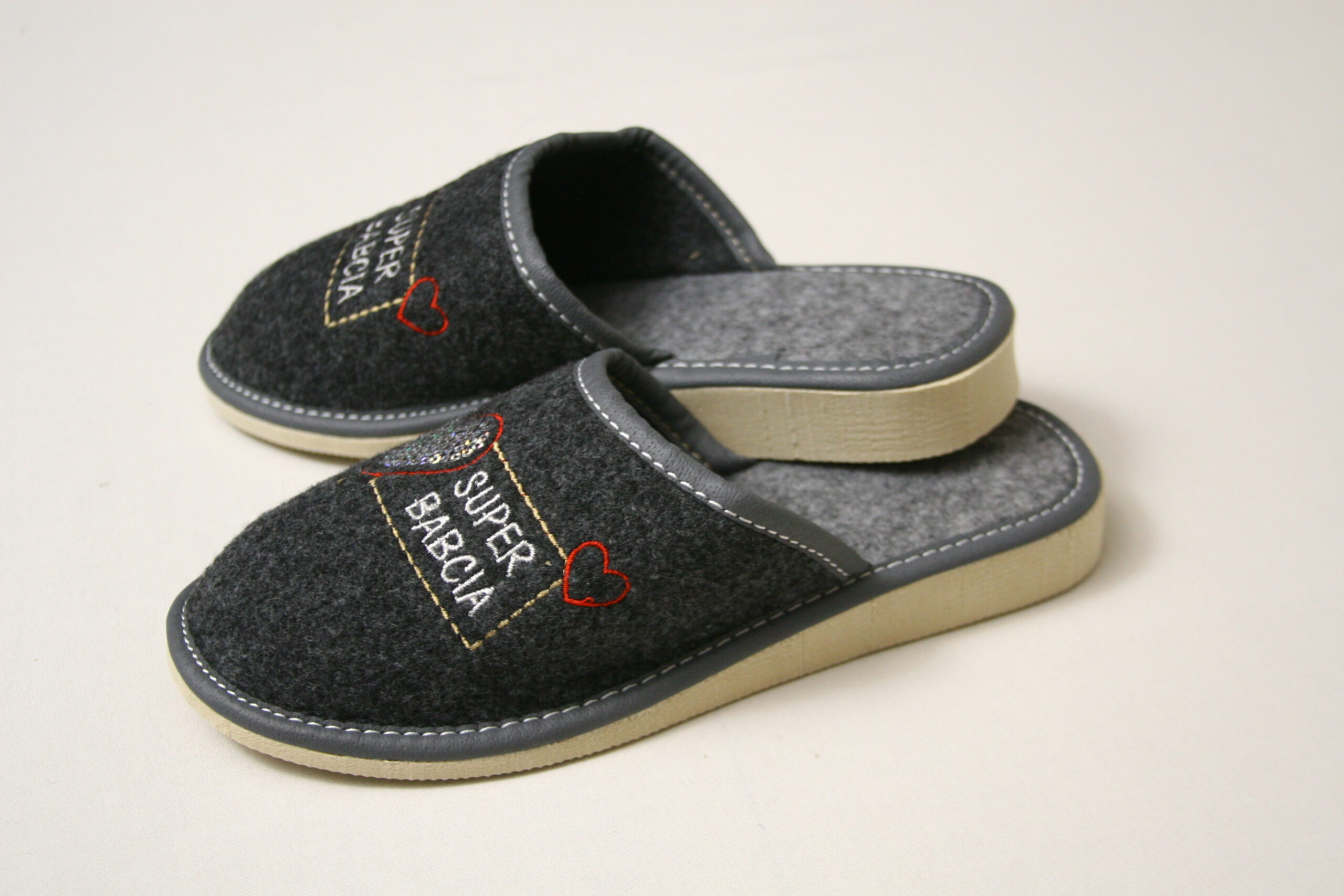 Eleganckie filcowe kapcie wsuwane, wygodne i ciepłe.