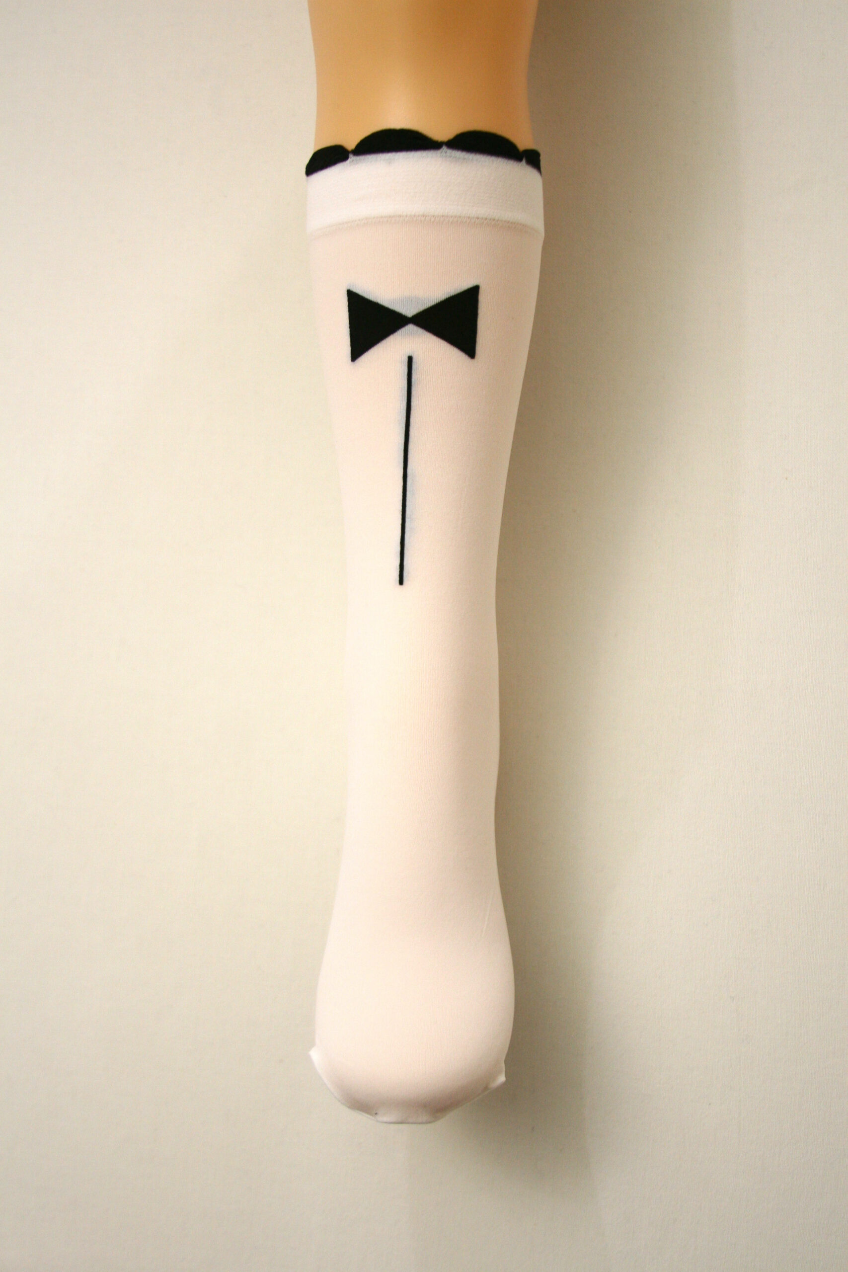 Podkolanówki Dziecięce Białe ozdobione czarną kokardą i nieuciskowym ściągaczem z fantazyjną czarną falbanką. Produkt Polski firmy Funpol.